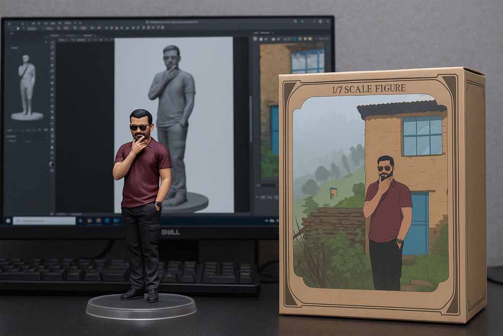 अपनी इमेज को अटैच कर ये Prompt डालें- Create a 1/7 scale commercialised figurine of the characters in the picture, in a realistic style, in a real environment. The figurine is placed on a computer desk. The figurine has a round transparent acrylic base, with no text on the base. The content on the computer screen is a 3D modeling process of this figurine. Next to the computer screen is a toy packaging box, designed in a style reminiscent of high-quality collectible figures, printed with original artwork. The packaging features two-dimensional flat illustrations. आप चाहें तो अपनी ओर से कुछ बदलाव डाल सकते हैं। उसको फॉलो करके भी इमेज बन जाएगी।