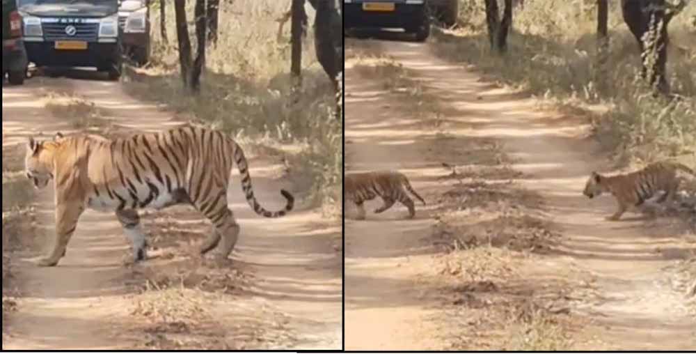 पांच शावकों के साथ कच्ची सड़क पर आई बाघिन