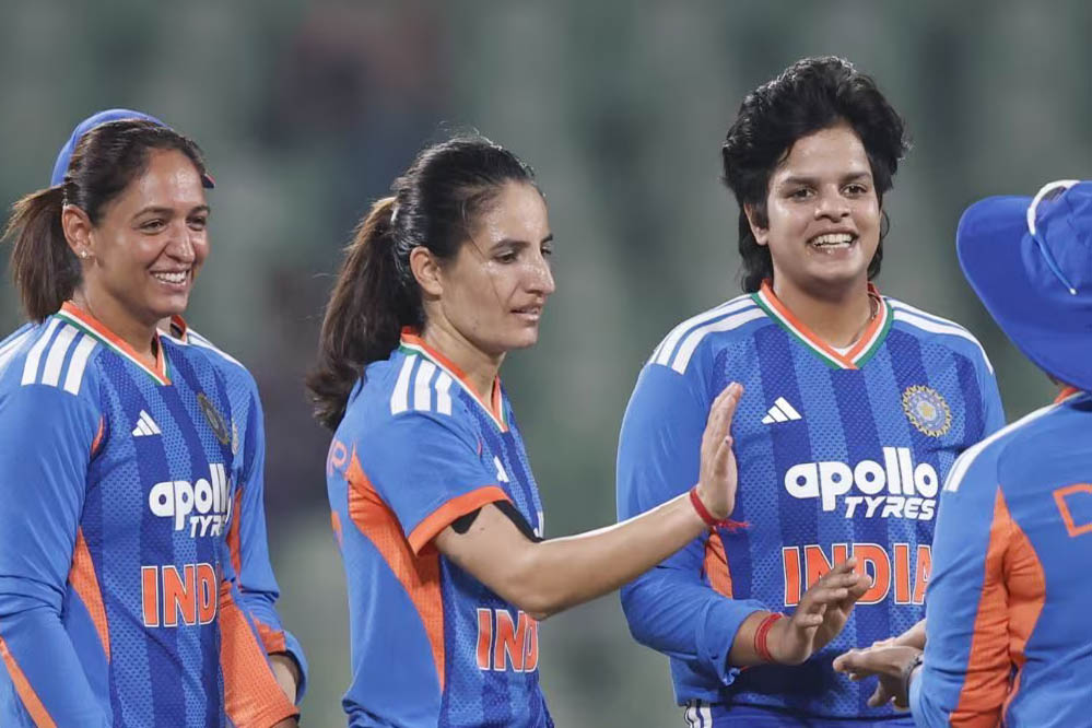 तीसरे टी20I में भारतीय महिला टीम की प्लेइंग 11: स्मृति मंधाना, शेफाली वर्मा, जेमिमा रोड्रिग्स, हरमनप्रीत कौर (कप्तान), ऋचा घोष (विकेटकीपर), दीप्ति शर्मा, अमनजोत कौर, रेणुका सिंह ठाकुर, क्रांति गौड़, वैष्णवी शर्मा और श्री चरणी.