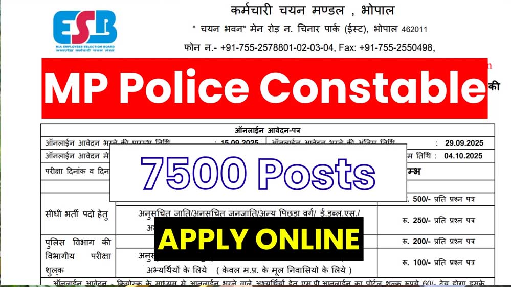 मध्य प्रदेश में पुलिस कांस्टेबल भर्ती के लिए आवेदन की अंतिम तारीख 29 सितंबर 2025 निर्धारित की गई है। इस भर्ती के जरिए कुल 7500 रिक्त पदों पर नियुक्तियां होंगी। जो भी अभ्यर्थी इस भर्ती के लिए पात्र हैं और अभी तक फॉर्म नहीं भर पाए हैं, वे तुरंत मध्य प्रदेश कर्मचारी चयन मंडल (MPESB) की आधिकारिक वेबसाइट esb.mp.gov.in पर जाकर आवेदन कर सकते हैं। आवेदन करने के बाद यदि किसी अभ्यर्थी से कोई गलती हो गई है, तो उसे 4 अक्तूबर 2025 तक ठीक किया जा सकता है।