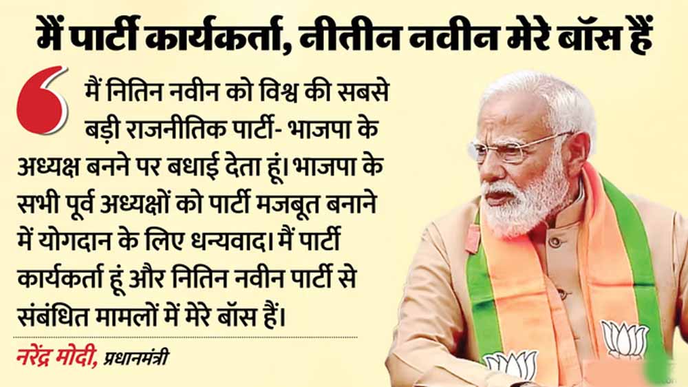 पीएम मोदी ने नितिन नवीन को शुभकामनाएं देते हुए कहा कि नितिन नवीन को दुनिया के सबसे बड़े राजनीतिक दल का राष्ट्रीय अध्यक्ष चुने जाने पर बधाई देता हूं। पीएम मोदी ने कहा कि भाजपा का ये संगठन पर्व देश के कार्यकर्ता केंद्रित सोच का प्रतीक है। पीएम मोदी ने कहा, 'हमारा नेतृत्व परंपरा से चलता है, अनुभव से समृद्ध होता है और जनसेवा-राष्ट्रसेवा के भाव से संगठन को आगे बढ़ाता है। हमने शून्य से शिखर तक का सफर देखा है।' पीएम मोदी ने भाजपा के सभी पूर्व अध्यक्षों का अभिनंदन किया। उन्होंने कहा कि आज भाजपा का जितना फोकस संगठन के विस्तार पर है, उतना ही कार्यकर्ता के निर्माण पर भी है। उन्होंने कहा कि मैं मुख्यमंत्री से लेकर प्रधानमंत्री भी रहा, लेकिन मैं भाजपा का कार्यकर्ता रहा। उन्होंने कहा कि मैं कार्यकर्ता हूं और नितिन नवीन मेरे बॉस हैं।